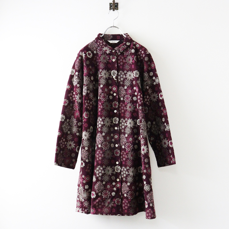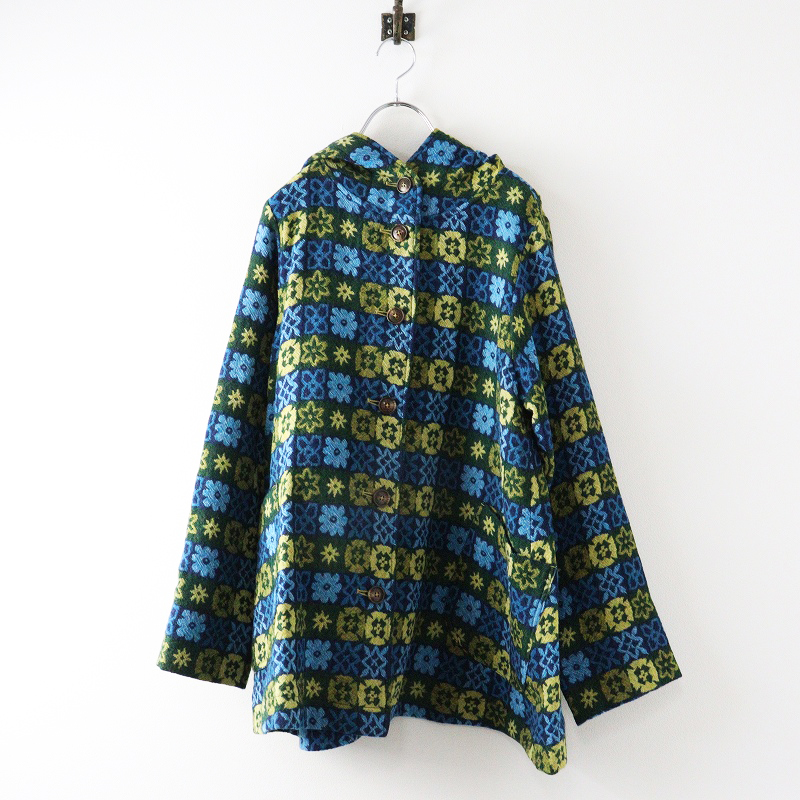 コットンハウスアヤ Cotton House Aya フラワーボーダー柄織り ウール縮絨 フード付きミディコート