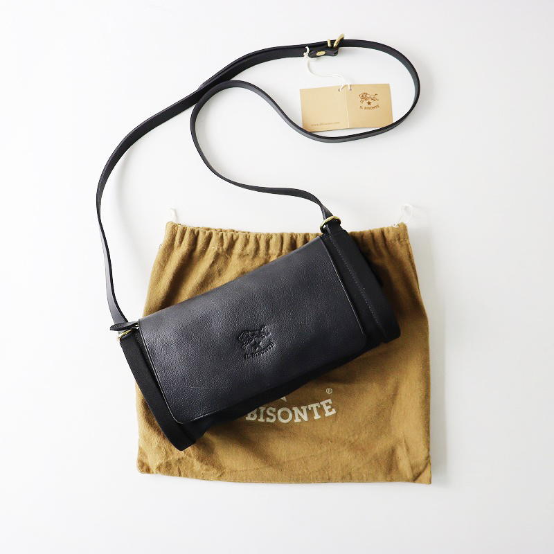 イルビゾンテ IL BISONTE 筒型 レザーフラップ キャンバスショルダーバッグ