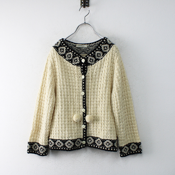 :KANEKO ISAO カネコイサオ ボンボン付 柄編み ウール 透かしニットカーディガン