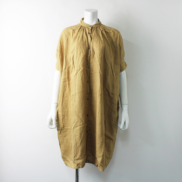 :Honnete オネット リネン バンドカラー ギャザー シャツワンピース