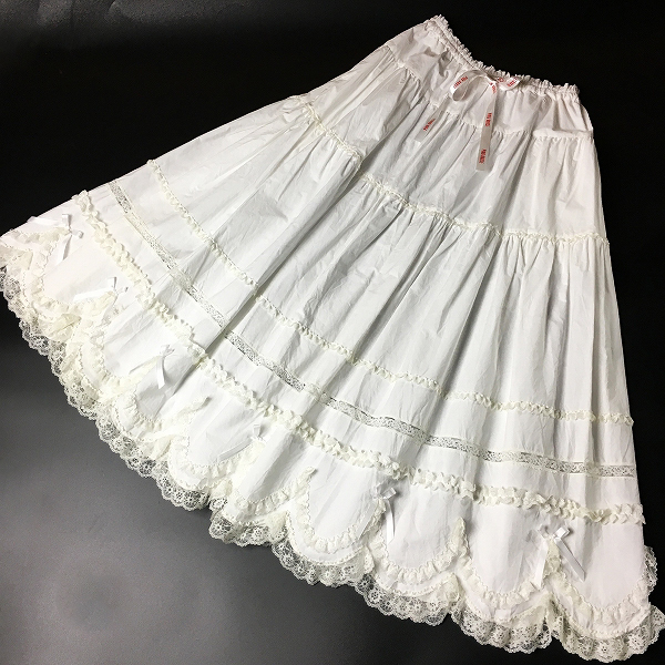 :2019年 PINK HOUSE ピンクハウス 綿ローン ロゴウエスト紐 トーションレースフリルフレアスカート