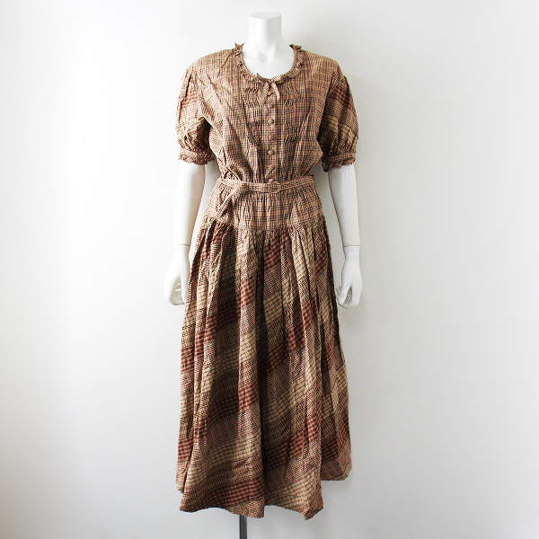 :KANEKO ISAO カネコイサオ ピコフリル チェック柄パッチワーク ウエスト絞り ティアードフレアワンピース