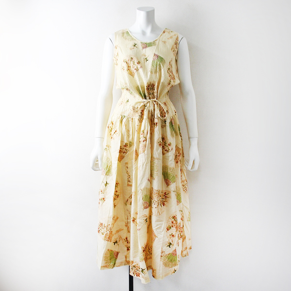 :KANEKO ISAO カネコイサオ 綿ローン 扇子プリント ピンタックノースリーブワンピース