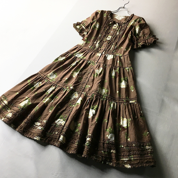 :PINK HOUSE ピンクハウス ホワイトローズプリント ピコフリル ティアードギャザー前開きワンピース