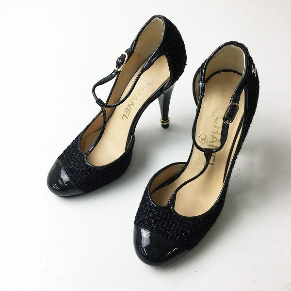 :CHANEL シャネル ココマーク付き ツイードTストラップパンプス