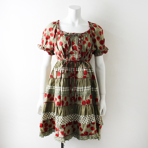 :PINK HOUSE ピンクハウス チェリー柄 ピコフリル 綿ローン チェック ティアードフレアワンピー