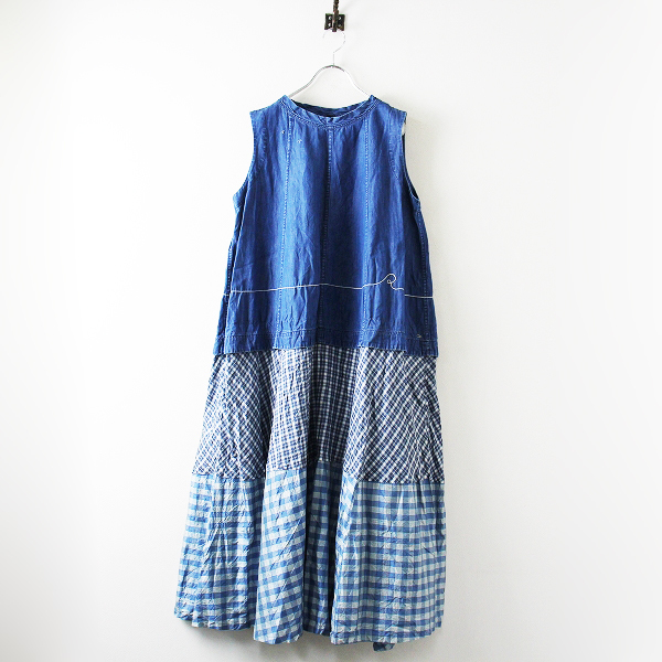 :45R フォーティーファイブアール 再び デニムXシルクパッチワークチェック切替 ノースリーブワンピース