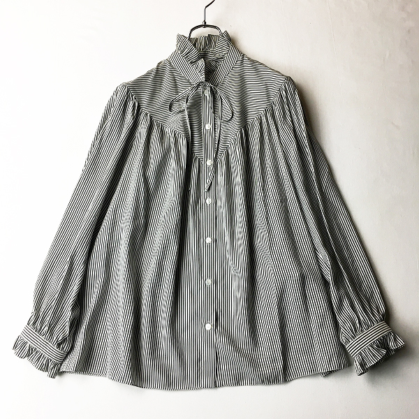 :CELINE セリーヌ シルク100% ストライプ フリルVギャザー長袖シャツ