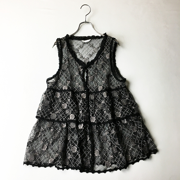 :PINK HOUSE ピンクハウス バラ刺繍 ピコフリル チュール ノースリーブブラウス